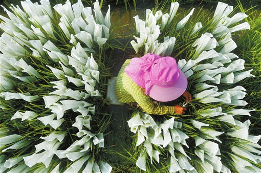 4月7日上午,海南省三亚市吉阳区,湖南杂交水稻研究中心三亚南繁试验基地,技术员史开群忙着进行小品种人工杂交授粉,犹如置身“花海”。为了防止串粉,授粉后的稻穗都套上套袋,宛如花束。 |