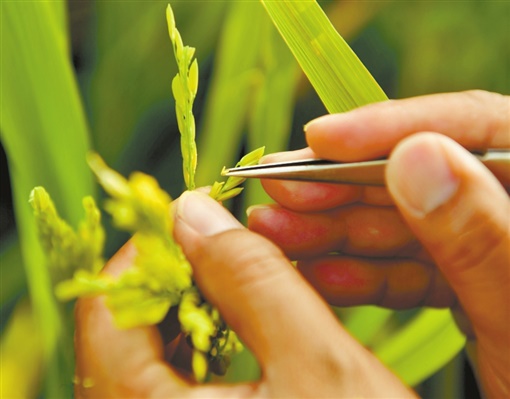 “眼下正是水稻的抽穗期,扬花时间很短,是杂交、孕育新品种的关键期,必须在几天之内,做好成千上万个杂交水稻配组。剪穗、去雄、选株、授粉、套袋……人工选育杂交水稻时就跟动手术一样。”水稻栽培专家李建武博士介绍说。一个成熟的水稻品种从无到有,育种选种试验至少需8至9年的时间周期,10个世代繁殖过程后才推广种植。“每培育一个品种就像养育一个孩子。”