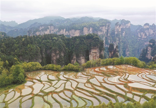 4月19日,张家界国家森林公园袁家界景区,连绵耸立的峰林、错落有致的梯田,构成一幅美丽的画卷。 吴勇兵 摄