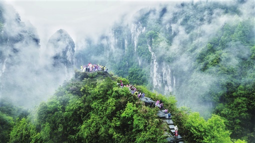 4月20日,吉首市矮寨奇观旅游区天问台,峡谷山峦在云雾中宛如仙境,让游客流连忘返。田源 摄 |