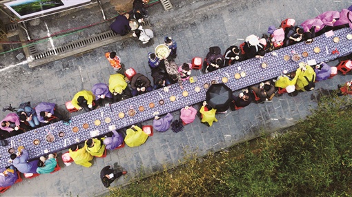 4月20日,吉首市马颈坳镇隘口村,苗家人在村里摆起长龙宴,欢迎来自四面八方的游客。 周翔宇 摄 |