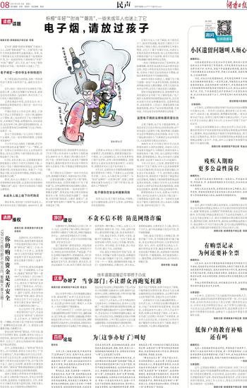 5月初,在长沙某小区,记者看到穿着中职校服的小刘和几个同学正在抽电子烟,小刘说:“买电子烟的时候商家说过,这东西和香烟不同,对身体没有害处。我抽了一下觉得还不错,而且很多同学都抽,我要是不抽,就显得不合群。”