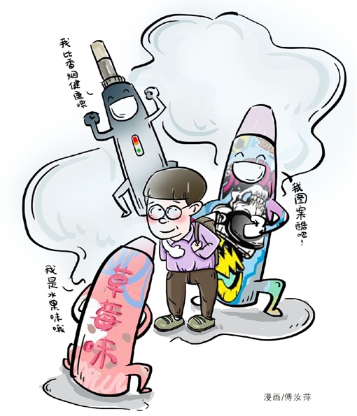 近年来,随着“吸烟有害健康”日益深入人心,宣称“帮助戒烟”“无二手烟”的电子烟作为传统卷烟的替代品越来越火。本来,电子烟的诞生是为想戒烟的瘾君子起到缓冲作用,但一些商家将电子烟标榜为“年轻”“时尚”“潮流”,误人不浅。由于对电子烟的危害认识不清,一些未成年人也迷上了它。