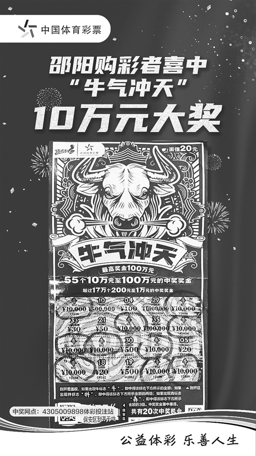 据体彩代销者雷仁君介绍,中奖的是位年轻小伙,之前进店是买超级大乐透的,在他的推荐下玩起了即开型体育彩票“顶呱刮”。5月4日下午3时许,这位年轻小伙又来到店里,选了一本“牛气冲天”,刮到一半多时开心地说中了10万元大奖。当时店里有好几个人,大家都以为这位年轻小伙开玩笑。结果他一看票面,上面真的有10个“牛”标志!每个下方金额都是1万元,共计10万元!这位年轻小伙激动地当场要兑奖,不过这可是大奖,需要缴税,彩票店没兑奖权限,需要5月6日带上彩票和身份证到邵阳市体彩分中心兑奖。