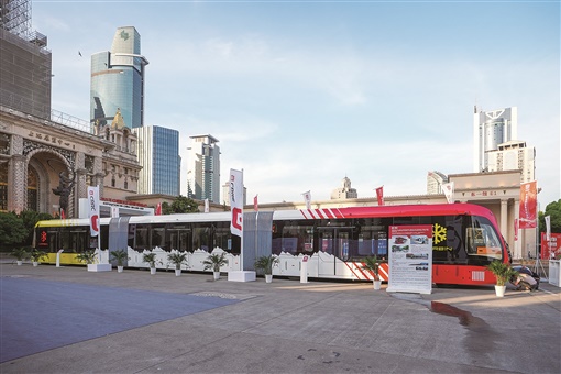 5月10日,上海展览中心外展出的中车智轨电车。当天,2021年中国品牌日活动在上海展览中心开幕。湖南日报·新湖南客户端记者 辜鹏博 摄 (相关报道见2版)