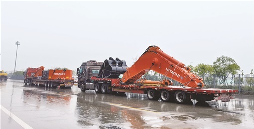 5月13日上午,日立建机带来的EX1200超大型液压挖掘机,由4辆平板车装载运输,抵达长沙国际会展中心。这将是今年长沙国际工程机械展上展出的最大挖掘机。湖南日报·新湖南客户端记者 曹娴摄(详见2版)