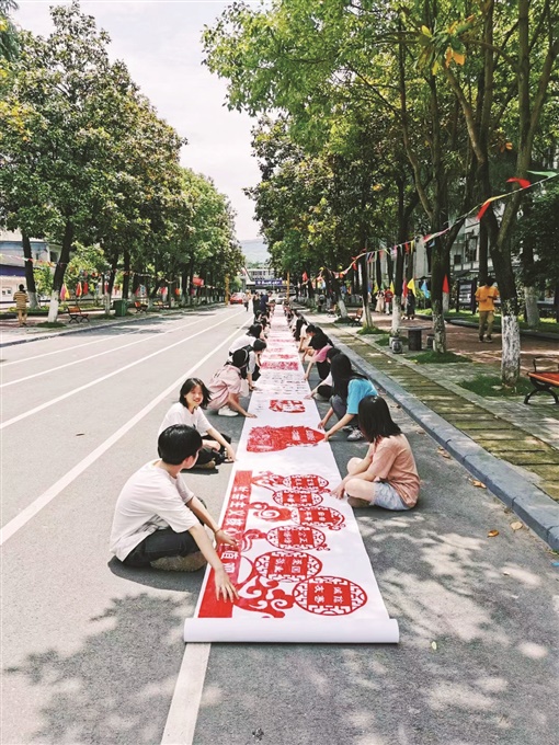 5月16日,师生在展示百米长卷剪纸作品《党史百年》。近期,郴州市海纳中等职业技术学校2名教师带领50余名学生精心筹备,选取了建党百年历程中45个重要的历史节点和重大成就,创作出45幅主题剪纸作品,组合成剪纸百米长卷《党史百年》,献礼建党100周年。