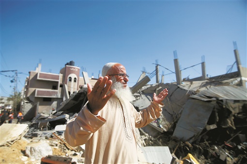5月16日,一名巴勒斯坦男子在加沙地带拉法查看一栋在以军空袭中被炸毁的房屋。