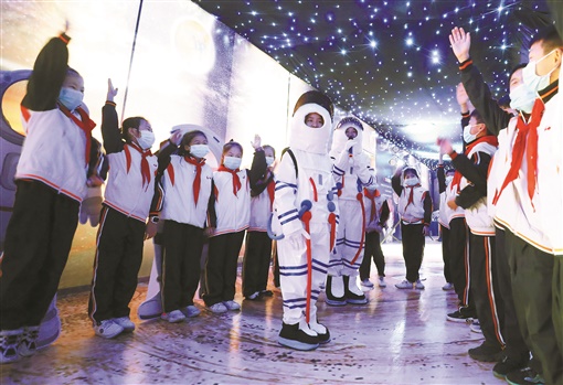 5月18日,学生在体验太空服的穿戴。当天是第45个国际博物馆日,衡阳市南岳区南岳完小组织学生来到南岳区祝融火文化园“祝融号”火星体验馆参观学习。曹正平 周翔宇 摄影报道