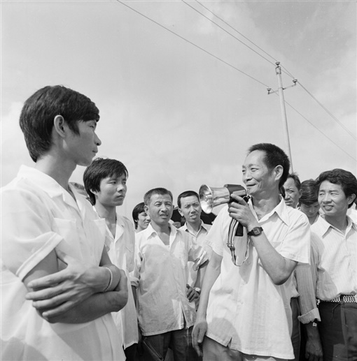 1987年8月29日,袁隆平在湖南杂交水稻研究中心试验基地会见参加百乡振兴会的代表,并介绍杂交水稻研究情况。陈金华 摄 |