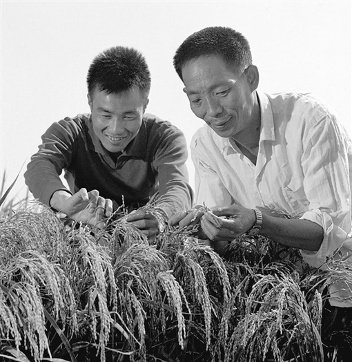 1976年,袁隆平(右)与同事李必湖在观察杂交水稻生长情况。新华社记者 摄 |