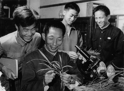 上世纪80年代初,袁隆平(左二)在安江农校研究杂交水稻。通讯员 摄 |