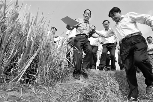 2014年10月10日,溆浦县横板桥乡红星村超级稻基地,工作人员搀扶84岁的袁隆平下田参加超级杂交稻测产。湖南日报·新湖南客户端记者 李健 摄 |