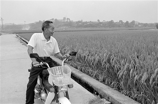 1999年8月5日,袁隆平骑着小摩托车来到试验田边,察看超级杂交稻生长情况。陈金华 摄 |