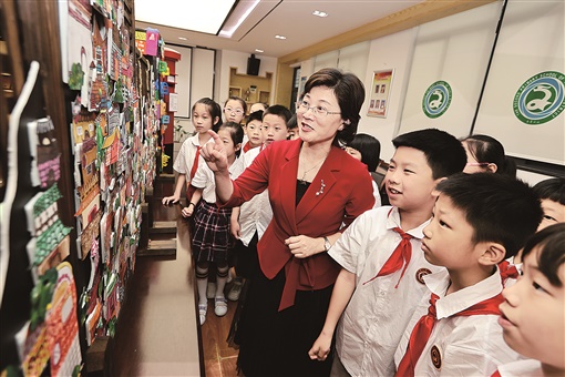 5月28日,长沙市岳麓区第二小学,师生在交流创作心得。当天,该校开展“童心颂党·百年辉煌”主题文化墙创作比赛,师生围绕红船精神、井冈山精神等6个主题进行手工设计创作,让红色基因代代相传。