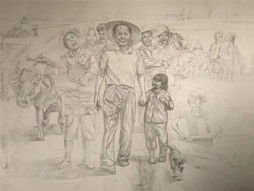 去年下半年,湖南省美术家协会“百年恰是风华正茂”——庆祝中国共产党成立100周年大型美术创作工程选题申报通知下发到各市州,邵阳市油画家陈小川和刘建华,在众多选题中选中袁隆平院士作为创作题材,两人决定合作绘制一幅2000×1450mm的油画《杂交水稻之父——袁隆平》。两位油画家考察杂交水稻基地,构思、确定主题立意为:杂交水稻之父袁隆平几十年如一日扎根杂交水稻,解决中国人的吃饭,为全人类做出卓越贡献。围绕此主题进行画面构图,袁隆平作为一位“稻田守望者”躬耕田野,脚踏实地,论文写在大地上。画面以夕阳洒满超级稻田的金黄为主调,红色拖拉机点缀其间,远处逶迤丘陵及农舍、稻香和炊烟。