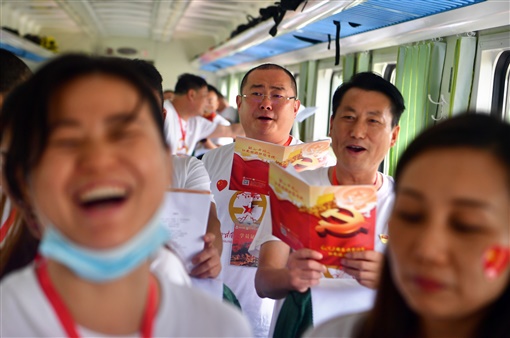 6月18日上午,韶山至井冈山红色专列上,湘潭交发集团百余名党员进行红歌比赛。湖南日报·新湖南客户端记者 郭立亮 摄