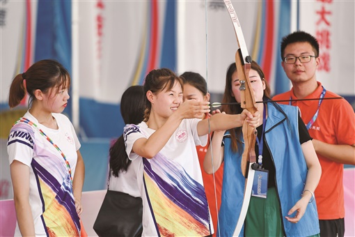 7月10日,长沙市天心区贺龙体育中心,市民体验射箭。当天,2021长沙市首届体育消费节启动,50多家本土体育企业开展低价惠民活动,市民可以现场体验花式篮球、高尔夫、冰壶等运动项目。湖南日报·新湖南客户端记者 辜鹏博 摄
