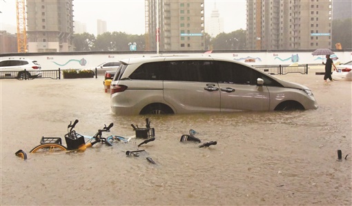 图为当日,车辆在郑州市街头被淹。