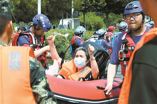 近日,受持续强降雨影响,河南省新乡卫辉市城区积水严重。目前,来自全国各地的救援力量利用橡皮艇、冲锋舟等设备搜救、转移被困人员。7月27日,一位被救老人向救援人员竖大拇指致谢。新华社发