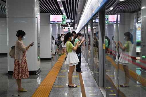8月2日18时30分,长沙地铁2号线湘江中路站,市民佩戴口罩间隔排队,有序乘车。 湖南日报·新湖南客户端记者 傅聪 摄 |
