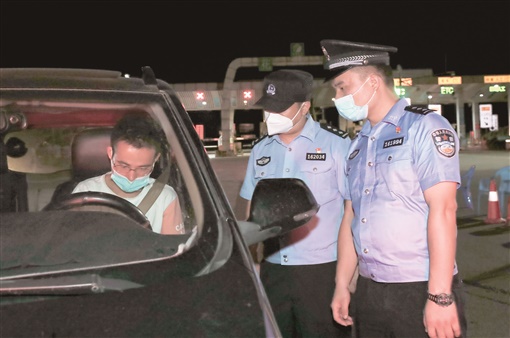 8月1日晚,张花高速花垣县城入口,公安干警在查验车辆司乘人员健康码、行程码等信息。连日来,花垣县公安、交通、卫健等部门协同开展疫情防控,对县境5个重点入口通道实行24小时轮班值守,把好疫情防控关。龙爱清 摄