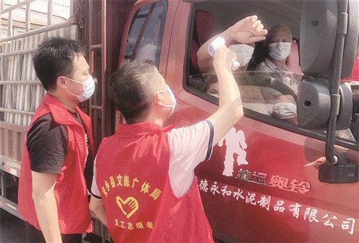 8月5日,安乡县高速公路出口处,县文旅广体局志愿者对出入车辆的司乘人员进行体温检测。连日来,该县全面关停县域内文化、旅游、体育行业室内密集场所,在各交通出入口设立疫情防控检查站,对过往人员进行体温检测和健康码、行程码查验,从严从实从细抓疫情防控工作。李胜男 摄