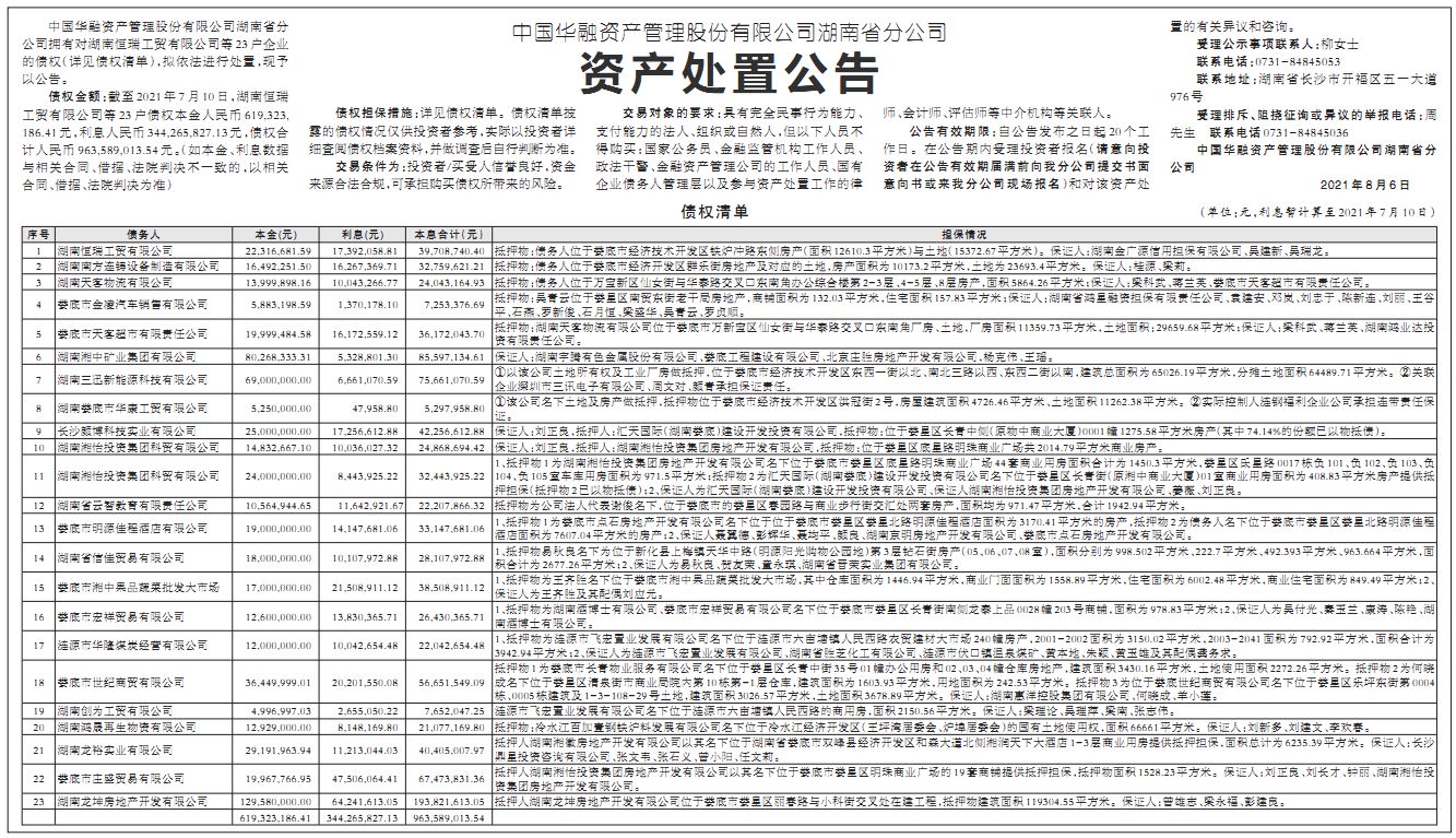 中国华融资产管理股份有限公司湖南省分公司 资产处置公告
