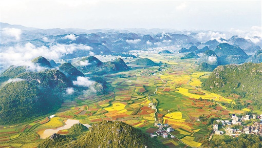 8月9日,江永县潇浦镇上欧村,金黄的稻谷、红色的高粱、翠绿的蔬菜、葱茏的青山,构成绚丽多彩的田园画卷。潘百旺 摄