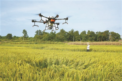 8月10日,宁远县太平镇新佳洞村,农民技术员操控无人机在田间喷洒有机农药。时值一季晚稻抽穗扬花关键期,当地及时组织农技员、乡镇干部深入田间地头,开展病虫害监测和防控服务,确保粮食丰产丰收。