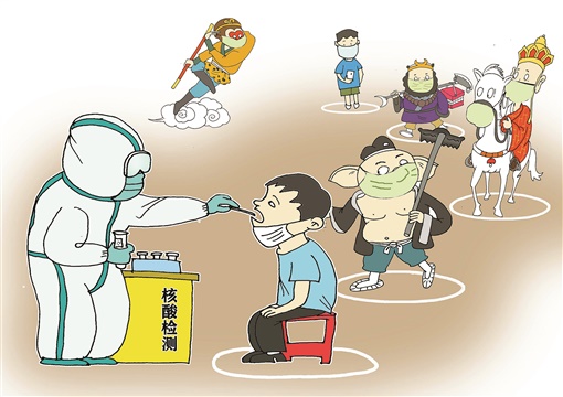 在张家界一核酸检测点,为保持安全距离,市民站在粉笔画的圆圈内排队,每个圆圈相隔一米。前一位市民核酸检测完成后,人们就依次移动到前一个圈内。这种保持安全距离的方式,被网友们形象地称为“悟空圈”。这种“画圈圈”的办法,简单易行,值得推介。 画/沈海涛 文/华生