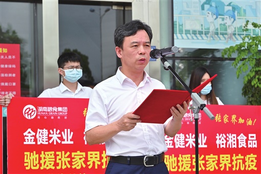 8月16日上午11时许,装载着湖南粮食集团旗下“金健”“裕湘”“帅牌”“放心粮油”米、面、油、牛奶等在内的300万元物资的物流车,从集团总部出发,直奔张家界。湖南粮食集团党委副书记、副董事长、总经理陈根荣主持本次活动。
