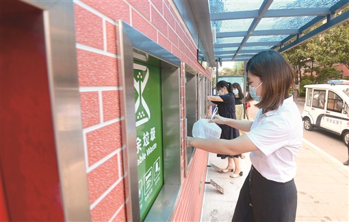 8月17日,长沙市芙蓉区芙蓉公寓,居民将生活垃圾投放到垃圾分类收集屋里。该收集屋占地约20平方米,设有6个垃圾分类投放窗口,可实现无接触式投放垃圾。长沙市计划用3年时间推进生活垃圾投放收集屋建设,芙蓉区在部分街道社区已先行先试建设了一批垃圾分类收集屋。 湖南日报·新湖南客户端记者 田超 王文 摄影报道