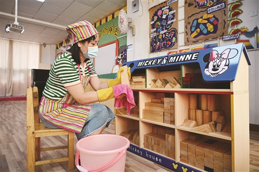 8月18日,永州市第一幼儿园,老师在对玩具进行消毒。连日来,永州市组织12-17周岁学生完成疫苗接种工作,对校园教室、宿舍、食堂等区域进行彻底消毒,全面排查整治校车、学校校舍、设施设备、饮用水卫生、周边环境等安全隐患,确保安全有序开学。 湖南日报·新湖南客户端记者 王柯沣 摄