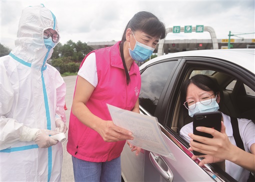 8月19日,衡武高速嘉禾县行廊收费站,巾帼志愿者在查验过往人员行程码、测量体温。8月以来,该县妇联组织巾帼志愿者投身防疫一线,开展防疫宣传、值班执勤、信息查验、疫苗接种、秩序维护、志愿服务等工作,助力疫情防控。