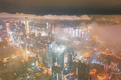 8月24日晚,雨后的长沙城区夜色五彩缤纷,高楼掩映在变幻万千的云雾之中,美不胜收。湖南日报·新湖南客户端记者 李健 摄