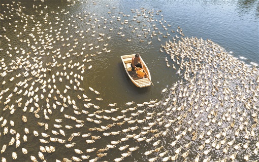 8月23日,临武县南强镇赛塘村委八仙下棋自然村临武鸭养殖场,村民在喂鸭子。近年,该县大力发展临武鸭产业,引导养鸭农户实现规模养殖,提高农业效率,增加农民收入。