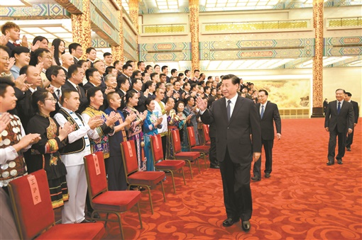 8月31日晚,第六届全国少数民族文艺会演开幕式文艺晚会在北京人民大会堂隆重举行。习近平、李克强、汪洋、王沪宁等党和国家领导人出席观看。这是演出开始前,习近平等会见文艺会演演职人员代表、组委会成员、56个民族的优秀基层党员代表等。新华社 发