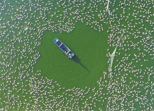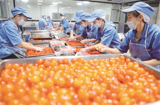 8月31日,衡东县霞流镇李花村,农户在放养鸭子(右图);该村鸭蛋加工企业员工在进行盐蛋黄加工、分拣、包装(上图)。近年,该村充分发挥禽蛋养殖加工传统优势,引进咸鸭蛋、卤蛋加工企业,带动村民养殖蛋鸭蛋鸡40多万羽,实现年加工咸鸭蛋、卤蛋2.8亿余枚,年产值3亿多元。
