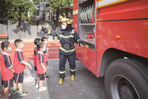 9月1日,消防员为小学生讲解消防知识。当天是长沙市中小学开学第一天,岳麓区新民小学邀请医生、民警、消防员代表现场教学,为学生开启新学期的安全实践第一课。湖南日报·新湖南客户端记者 辜鹏博 摄