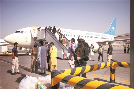 9月6日,人们在阿富汗喀布尔国际机场乘坐阿里亚纳航空公司的航班。该航空公司4日重启了国内从喀布尔到马扎里沙里夫和坎大哈的航线,成为阿富汗首家在喀布尔国际机场重启航班运营的航空公司。新华社发