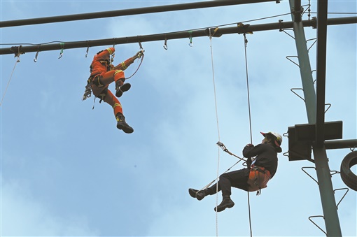 9月8日,消防员在进行绳索救援项目比拼。当天,2021年怀化市消防行业职业技能竞赛在怀化市消防救援支队举行,全市14支代表队100名精英参与竞赛项目,展现消防行业特殊的职业技能和风采。罗旸 田江华 摄影报道