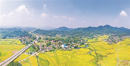9月12日,长沙市岳麓区雨敞坪镇,渐黄的稻田与村庄交相辉映,构成一幅色彩斑斓的丰收画卷。近年,我省大力建设高标准农田,加快推广“高产、优质、抗性强”的水稻新品种,确保了粮食播种面积和总产量的“双增”。湖南日报·新湖南客户端记者 李健 摄
