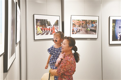 9月11日,观众在欣赏作品展。当天,由长沙市文联主办,长沙市摄影家协会承办的“新时代 新征程 新影像”长沙市第三届摄影艺术展和2021年“欢乐潇湘 品质长沙”摄影展在省文化馆开幕。该展览展出作品220件,展示了长沙市政治经济、文教卫生、社会民生、生态美景、抗疫扶贫等方面发展成就。湖南日报·新湖南客户端记者 郭立亮 辜鹏博 摄影报道