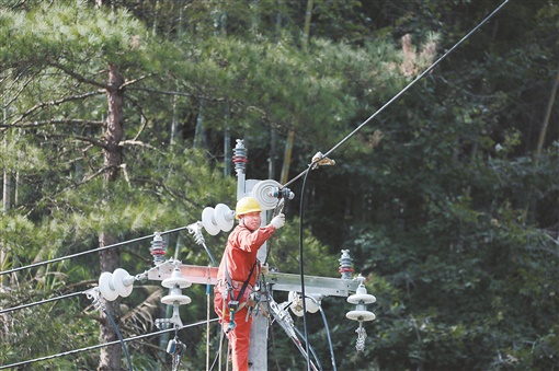 9月15日,桂东县沤江镇三洞村,电力工程队员在电网线路上作业。今年,桂东电网全面启动农网线路绝缘化改造工程,计划用2年时间完成全县农网干线10KV绝缘化升级改造,让全县人民用上安全、优质电源,助力乡村振兴。邓仁湘 摄