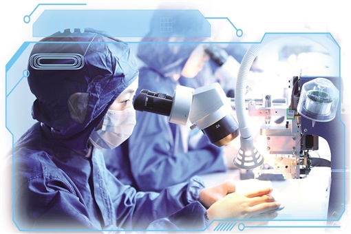 在菲尔斯特生产车间,工作人员正进行玻璃微熔压力传感器绑定工作。