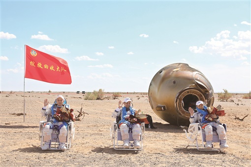 9月17日,神舟十二号载人飞船返回舱在东风着陆场成功着陆,航天员聂海胜(中)、刘伯明(右)、汤洪波安全顺利出舱,我国空间站阶段首次载人飞行任务取得圆满成功。新华社发