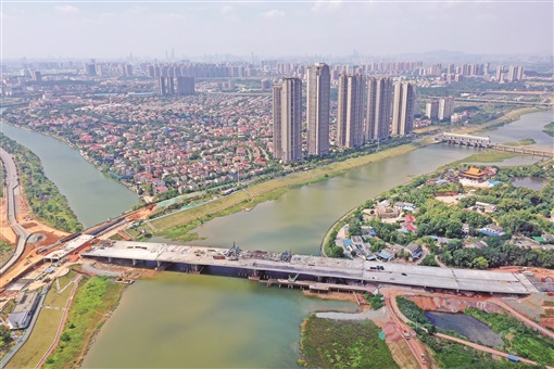 9月19日,长沙县香堤北路项目捞刀河大桥工地,建设者在进行桥梁左幅合龙施工。该项目包括桥梁和路基两部分,道路部分已竣工,大桥下构已全部完成,预计今年11月实现通车。