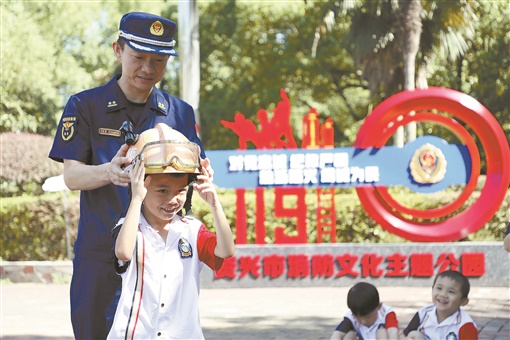 9月24日,资兴市消防文化主题公园,小朋友在消防员的指导下试戴消防帽。当天,资兴市首座消防文化主题公园正式投入使用。李科 摄