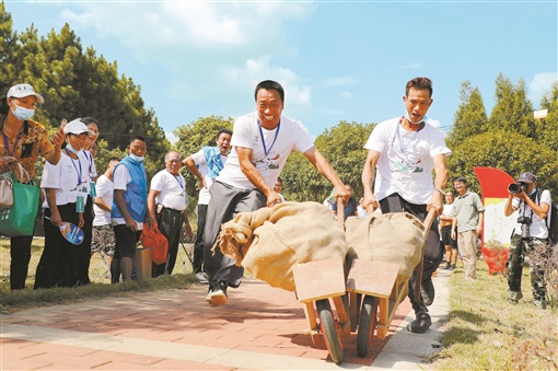9月26日,新田县枧头镇云溪欧家村,村民在参加运红薯比赛。当天,该县举行首届“新田红薯”文化艺术节,村民进行了运红薯、剁辣椒、捉鱼、抓鸭等趣味农事竞赛活动。